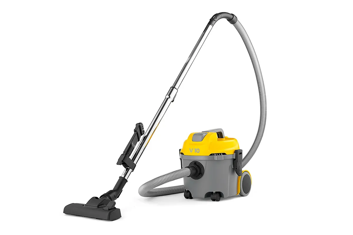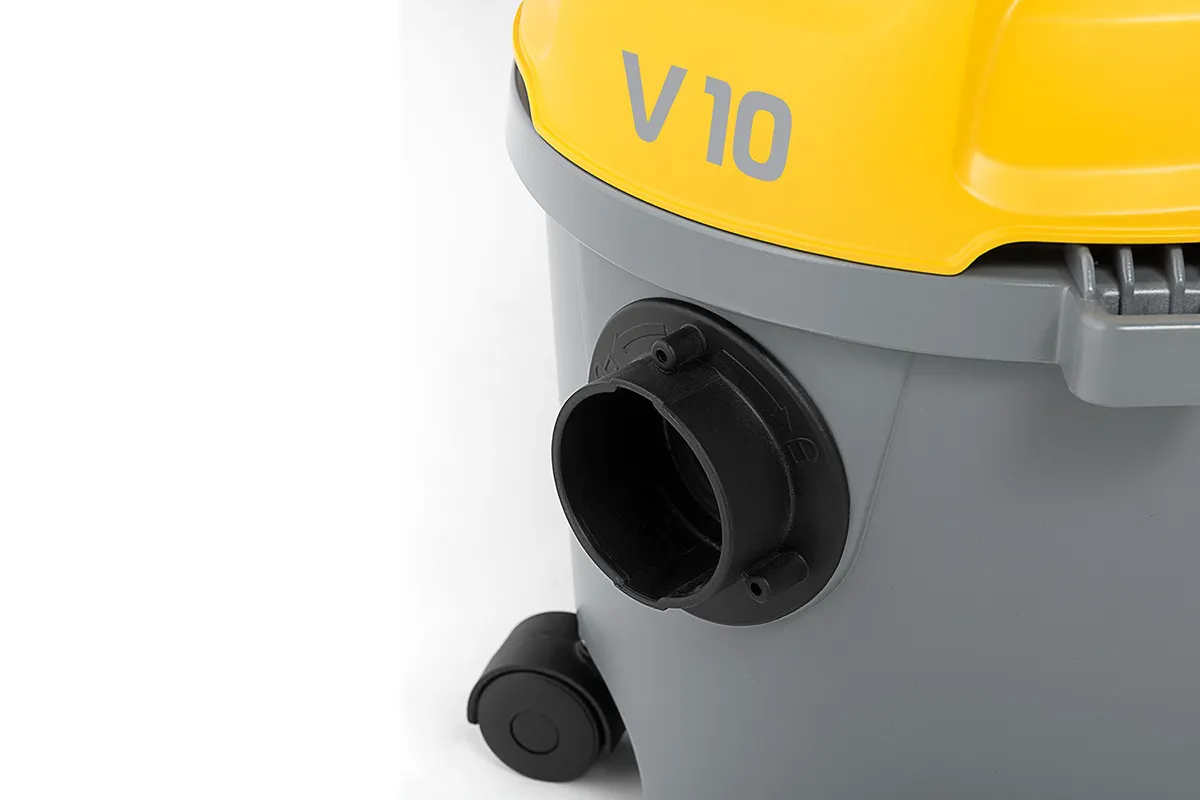 Le petit aspirateur professionnel V 10 est une heureuse conjonction de puissance et manoeuvrabilité, solidité et légèreté, qui rend cet appareil très compétitif. Bonne maniabilité garantie par les roues avant pivotantes et les roues arrière fixes de grand diamètre. Poignée ergonomique et systèmes de support accessoires et câble pour assurer une facilité d'utilisation maximale. Le moteur de 700 W, très professionnel, sa praticité d'utilisation et son encombrement minimum le rendent apte à répondre aux besoins de nettoyage dans les petites et moyennes zones telles que les hôtels, les bureaux, les magasins et les environnements domestiques. Doué de câble d'alimentation (10 m).