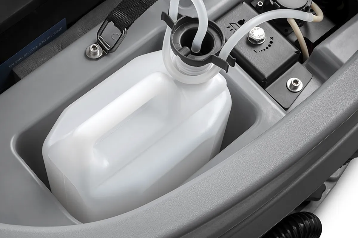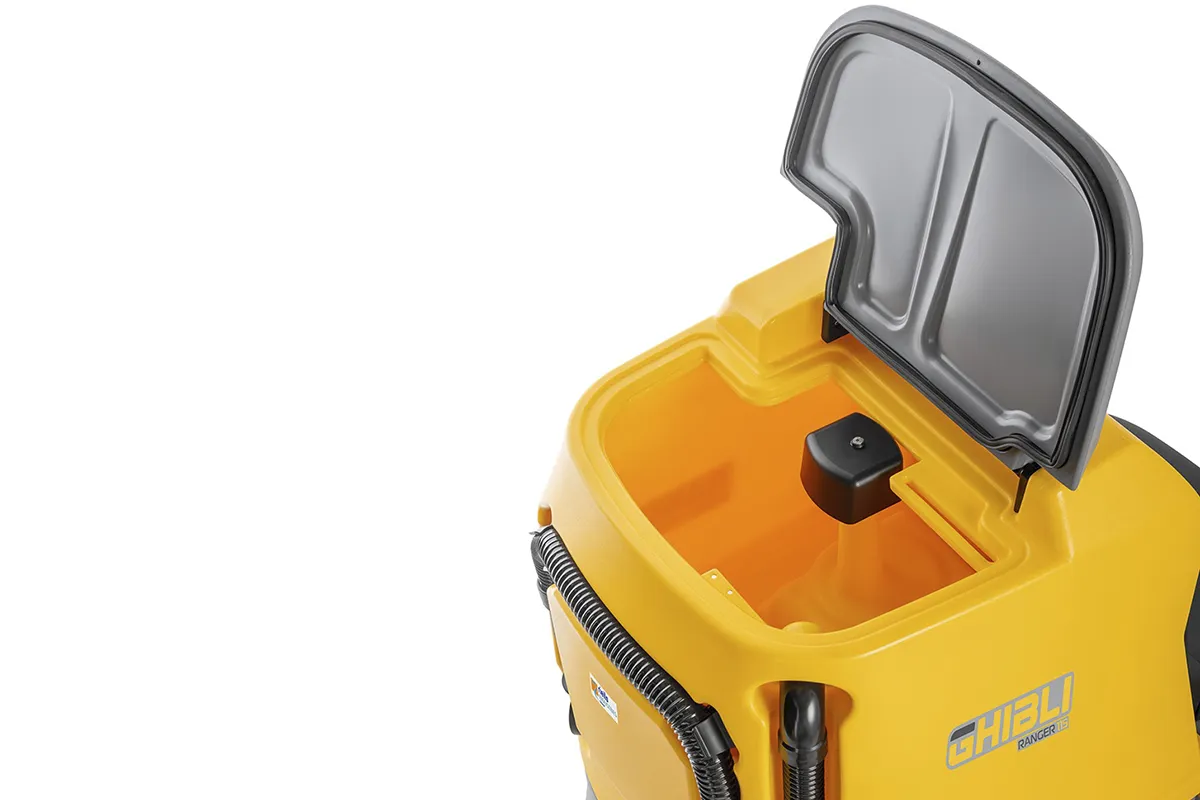 115 litres de capacité et la grande piste de lavage (850 mm) garantissent une productivité d’environ 5000 m²/h. L’extra-pression au sol et l’action du détergent (chemical mixing system) assurent d’excellents résultats de nettoyage; la tête en aluminium robuste, en mesure de s’adapter parfaitement à tous les obstacles, rend Ranger incomparable pour le nettoyage au «ras du mur». Le système d’essuyage, avec des caoutchoucs naturels en équipement standard, garantit les meilleurs résultats de séchage sur tous les types de surfaces et, en cas de chocs accidentels, il est en mesure de se déplacer et de rentrer automatiquement sous la structure de la machine en assurant une sécurité maximale et une facilité d’action.